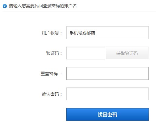 输入您注册时的手机号码或邮箱,点击获“取验证码”,系统会自动将一段6位随机数发送到您的手机或邮箱内,收到信息后,请将6位随机数填入验证码输入框,并填写两遍同样的新密码后点击“重置密码”即可进入系统开始使用。重置后以前所使用的密码会直接被新密码替换。